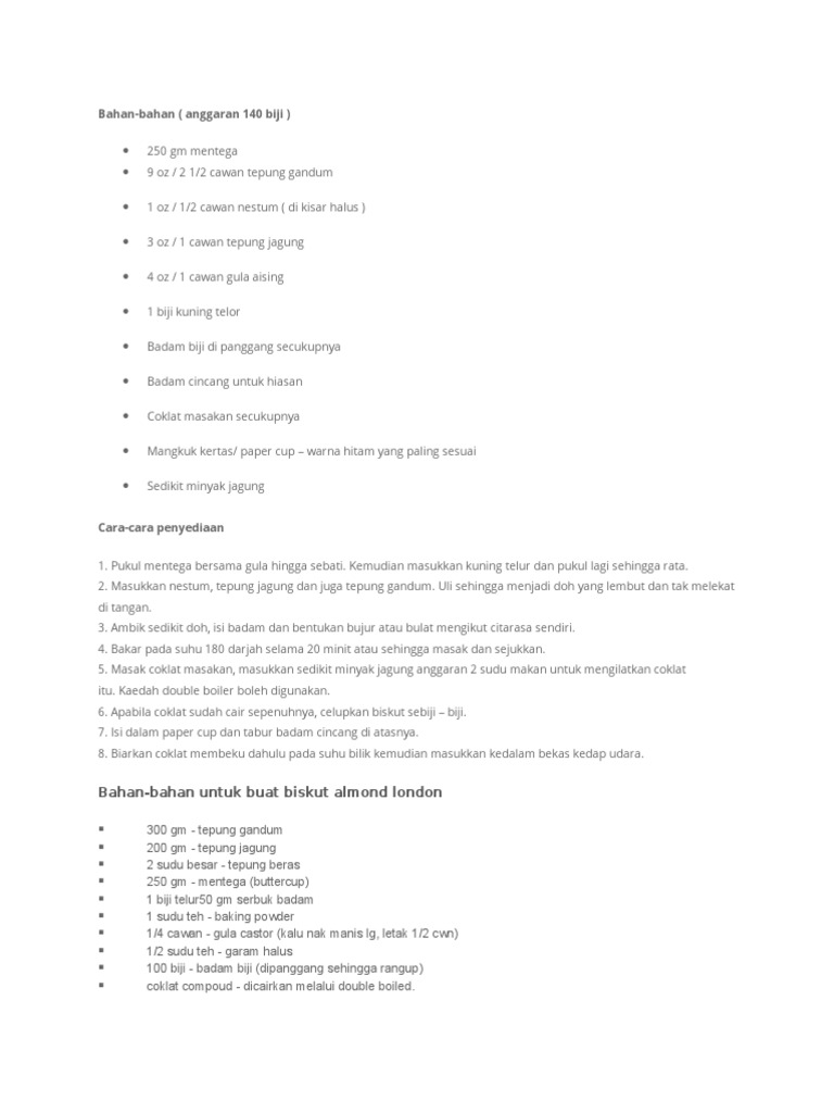 50 gm serbuk badam (optional). Biskut almond london kesukaan ramai.teman2 boleh cuba buat di rumah ya. Cooking ideas 10 months ago. Selain resepi biskut almond london, kami juga menulis resepi sedap dan mudah lainnya yang mendapat perkongsian ramai. Tak dinafikan kuih raya paling 'laku' ketika hari raya aidilfitri adalah almond london.